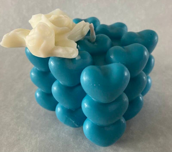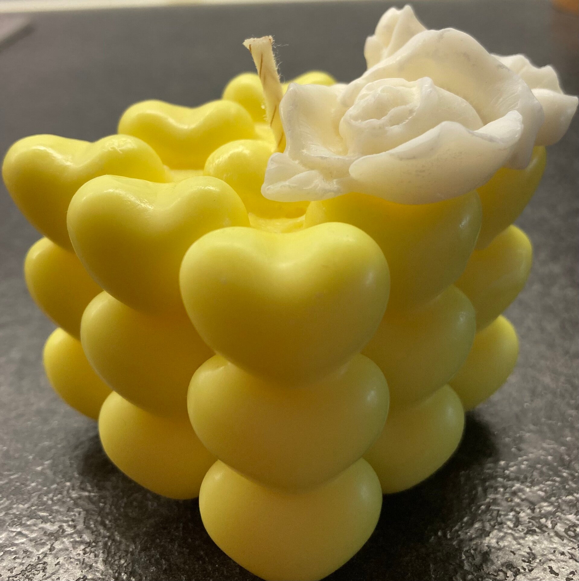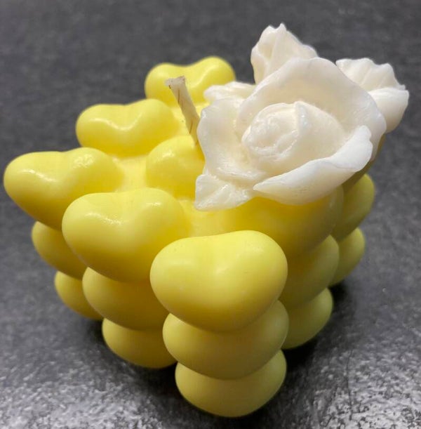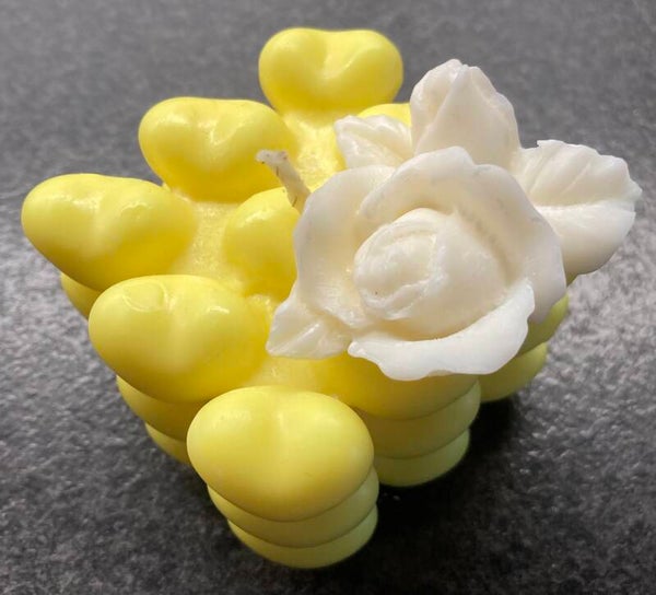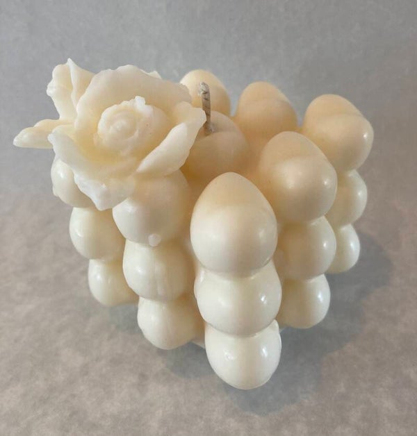 Koristeena valkoinen ruusu,joka on kaunis uniikki lisä kynttilän päällä.Tuoksuton.