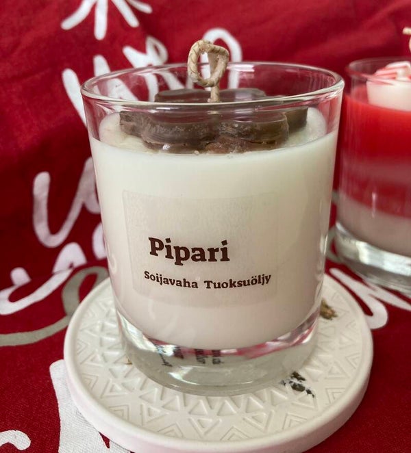 Piparin tuoksu saa aikaiseksi perinteisen jouluisen, makean ja mausteisen piparkakun tuoksun kotiisi.Koriste pipari kynttilän päällä on soijavahaa.