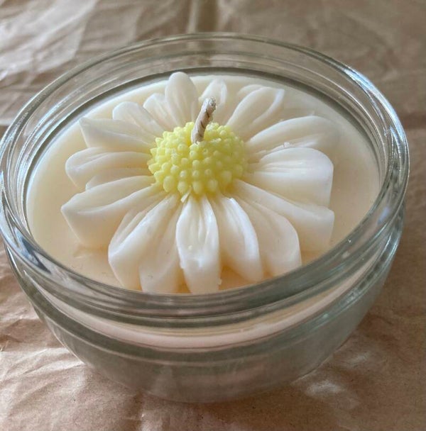 Kaunis päivänkakkara on valettu kierrätettyyn lasikuppiin.