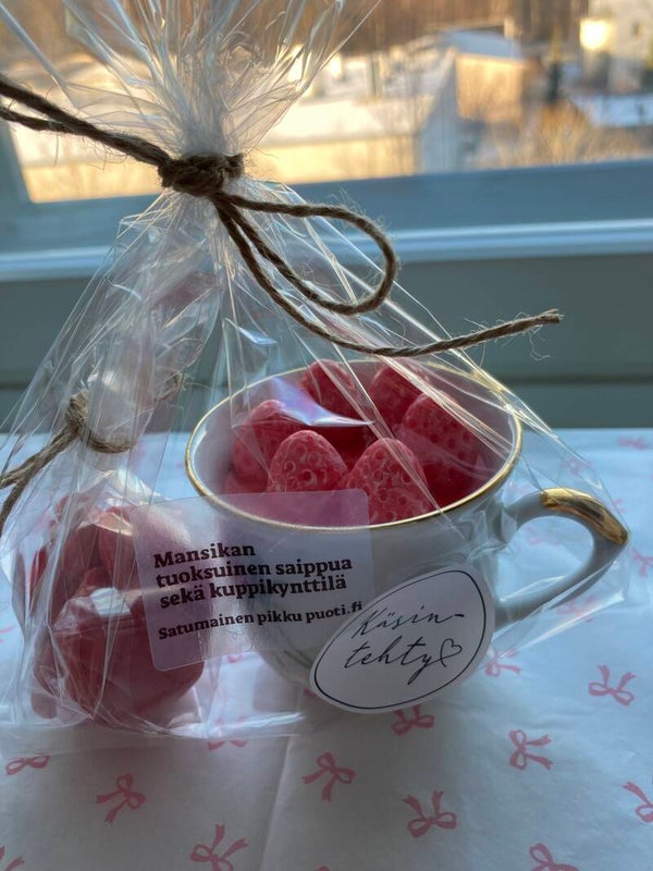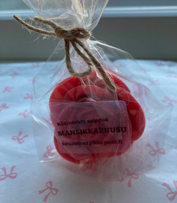 Käsintehty mansikan tuoksuinen ruusun muotoinen saippua.