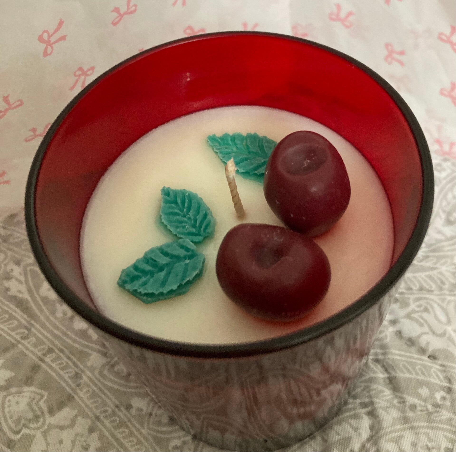 Kynttilä tuoksuu herkullisen makealta kirsikalta.